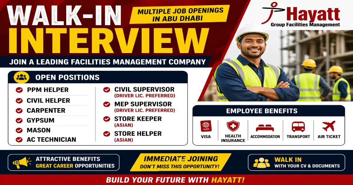 This walk-in interview in Abu Dhabi by Hayatt Group Facilities Management provides an excellent opportunity for job seekers aiming to work in the UAE’s growing facilities management sector. With multiple vacancies, strong benefits, and immediate hiring, this is a chance worth taking for candidates ready to start their careers or advance their skills.