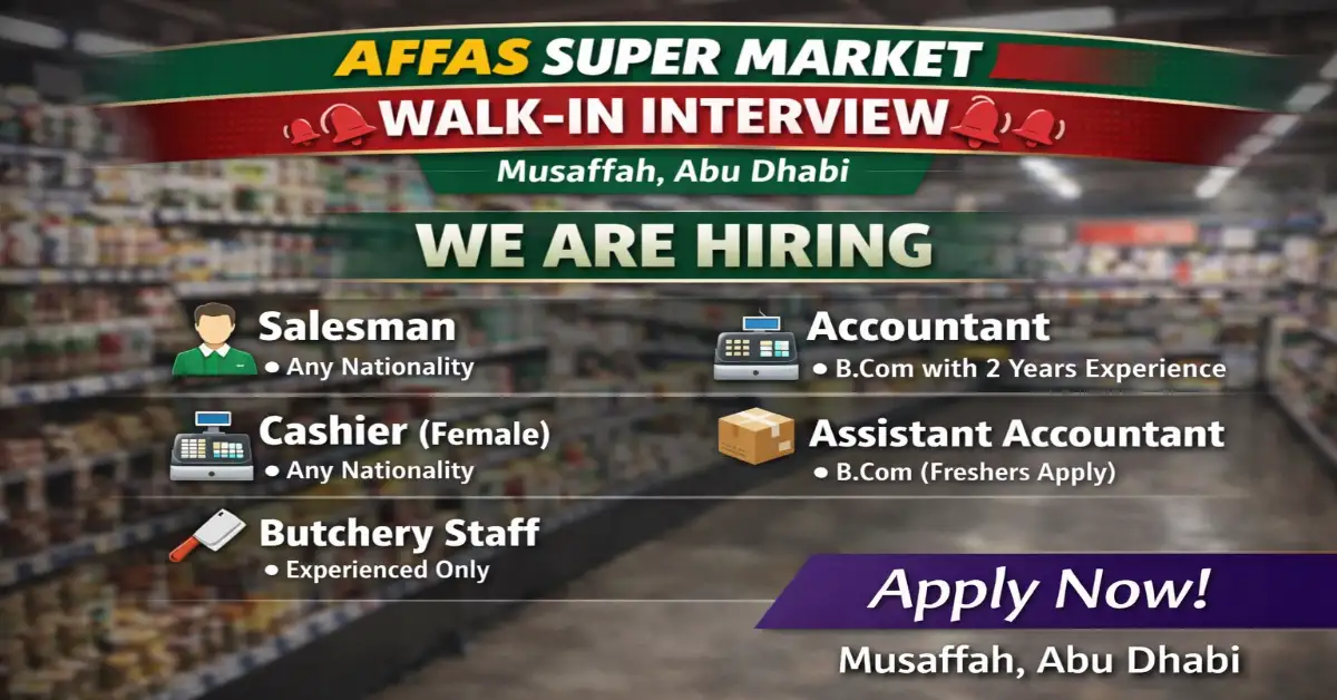 Retail and supermarket jobs in the UAE remain a popular career choice for job seekers looking for stable employment and immediate joining opportunities. Affas Super Market has announced a walk-in interview in Musaffah, Abu Dhabi, inviting candidates for multiple positions across sales, accounting, and store operations. This recruitment drive is suitable for both experienced candidates and fresh graduates, especially those who want to enter the supermarket and retail sector in the UAE.